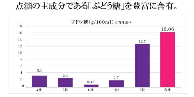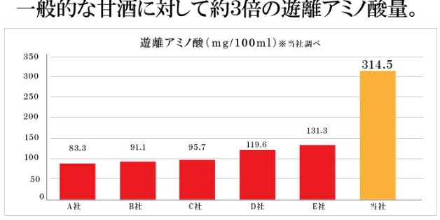 一般的な甘酒より約3倍も遊離アミノ酸量が多く点滴の主成分のぶどう糖を豊富に含有。