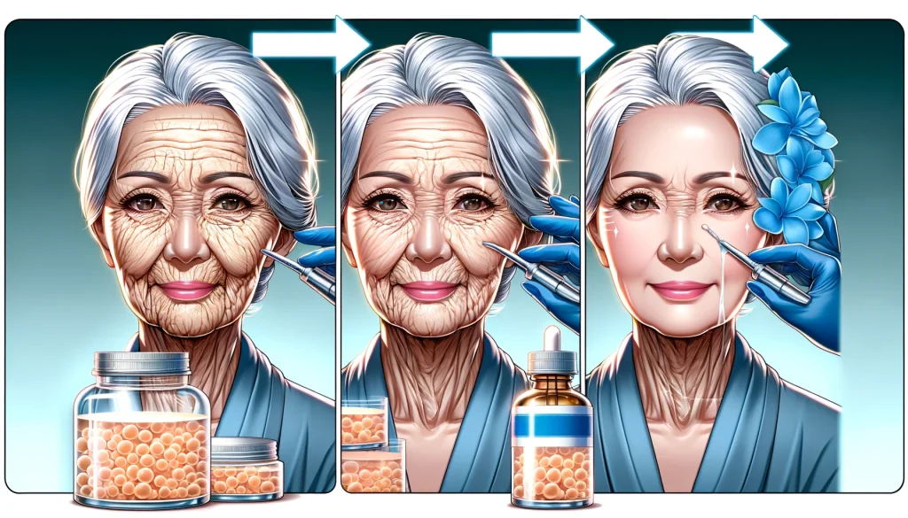 幹細胞は、骨折治療に革命をもたらしました。これらの細胞は、損傷した骨組織に注入されると、自然な骨の成長を促し、回復時間を大幅に短縮します。エクソハカセのイラストは、幹細胞が骨組織に組み込まれ、健康な骨へと変化していく過程を示しています。  ケーススタディ4: 肌の再生 エクソソームを、肌の若返り、活性化のために使用。(若々しい肌を取り戻す様子)